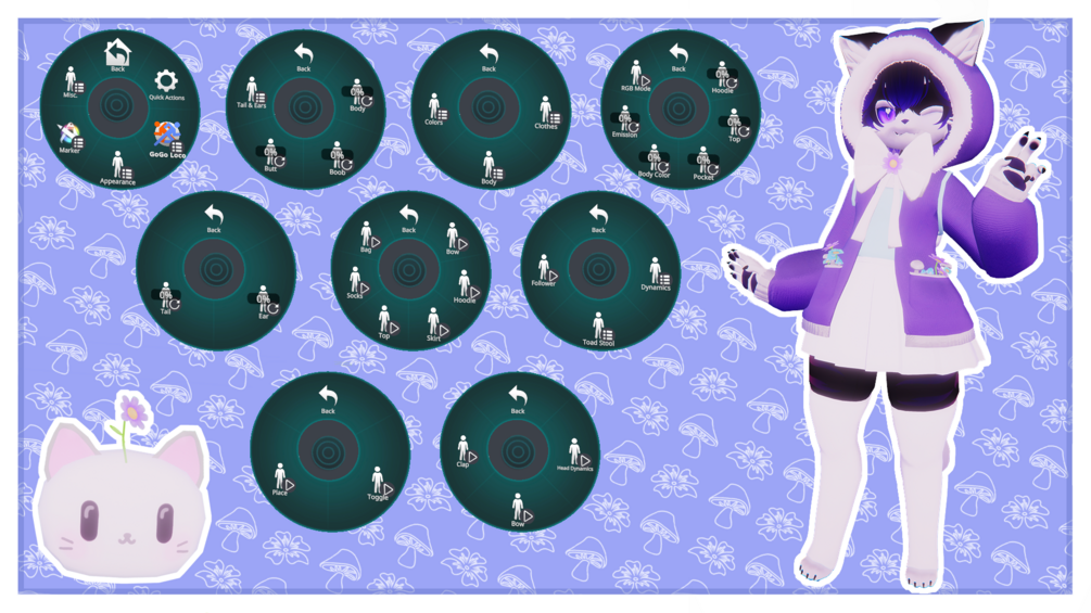 zooweemama I had to relearn how to make stuff for quest towards the end of this project. (why are there so many limitations ugh) I hope it is alright tho for both platforms. I do showcase only the pc version in the pictures and videos btw. Anyways Sadie is a lil cat cutie that likes to gather flowers and mushrooms. I hope you have fun with my first for sale furry avatar :3 Also thank you again viktor and amber for helping me with the pics and videos!!